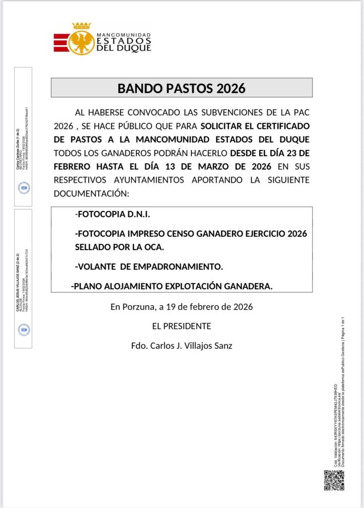 El Ayuntamiento de Porzuna informa que publicadas las Subvenciones de la PAC 2026 se puede solicitar el Certificado de Pastos a la Mancomunidad Estados del Duque en nuestras dependencias.