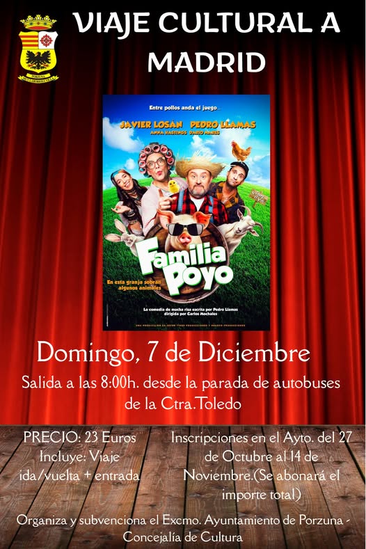 Las inscripciones se recogerán en las oficinas del Ayuntamiento de Porzuna del 27 de octubre al 14 de noviembre, abonando en el acto el importe total de los inscritos.