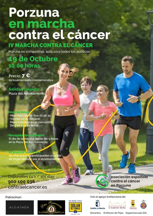 La IV MARCHA CONTRA EL CÁNCER , de carácter no competitivo y apta para todos los públicos, tendrá lugar el 19 de Octubre a las 10:00 horas. Su salida comenzará desde la Plaza del Ayuntamiento y se podrán recoger las camisetas identificativas desde las 9:00 horas de esa misma mañana.